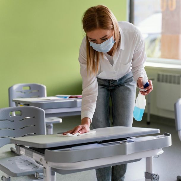 - Daily: Trash removal, surface disinfection, restroom cleaning.